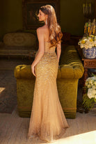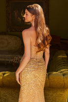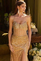 Sculpted and bold, this strapless gold gown features a corset bodice fully encrusted with sequins. Its bold silhouette and high-shine finish make it ideal for show-stopping entrances.