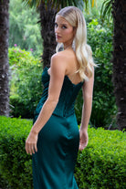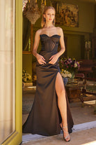 The ruched satin skirt skims the body gracefully and opens into a thigh-high slit, adding both allure and movement. Whether you’re attending prom, a gala, a pageant, or a red-carpet event, this gown ensures you’ll be the center of attention. Elegant, powerful, and luxuriously detailed – this is the statement gown you’ve been waiting for.