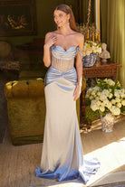 Silver and Blue Corset Satin Gown with Draped Bodice