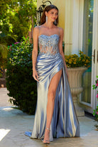 Misty Blue Embellished Sheer Corset Gown with Thigh