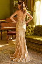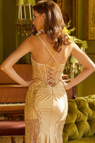 Gold Shimmer Corset Gown with Beaded Mesh Panels and Mermaid Fit GL3542