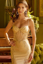 Glow like a goddess in this breathtaking gold shimmer gown, designed with a sculpted corset bodice, sheer illusion mesh sides, and lavish beaded detailing that sparkles from every angle. The fitted mermaid silhouette hugs the body and flares gracefully at the hem, while delicate spaghetti straps add a sleek, minimalist finish. This gown is a showstopper—perfect for commanding attention at any luxe event.
