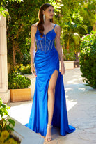 Vibrant and bold, this royal blue gown features a glitter-drenched corset bodice and sweetheart neckline. A high slit and sculpted fit complete the glamorous design.