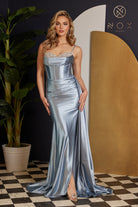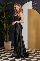 Command the room in this sleek Long Fitted Beaded Bustline Slit Dress. This glamorous sleeveless satin gown is designed to hug your curves, featuring a sophisticated high slit for movement and allure. The neckline is beautifully detailed with shimmering beading along the bustline, adding an element of luxury. The perfect fitted formal dress for prom night, pageants, or black-tie galas.