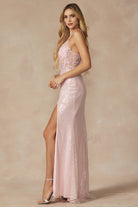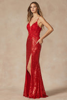 Expertly crafted with 100% polyester, this breathtaking dress offers three stunning color options - Ice Pink, Red, and Sky Blue. Its elegant and elongating silhouette features a flattering illusion V-neckline and a seductive open back design.