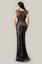Black Beaded Mesh Illusion Gown with Cap Sleeves | High Slit Art Deco Formal Dress CDCC4007