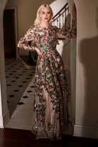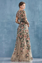 The Savannah Gown features a stunning copper floral sequin motif that gracefully flows over a metallic gold underlay, creating a captivating and luxurious look. Perfect for those seeking a fashionable long sleeve option, this gown offers elegant coverage with its sweetheart-lined bodice. The design flares into a soft A-line skirt, combining sophistication and comfort for any formal occasion.