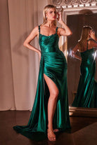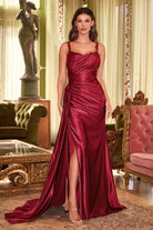 Emerald, Navy, Red, Dusty Blue | Satin Gown with Lace Embellishment, Ruched Bodice & High Slit CDCDS496