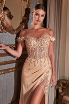 Off-Shoulder Satin Corset Gown with High Slit – Embellished Formal Dress with Train CDCD0186