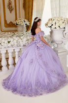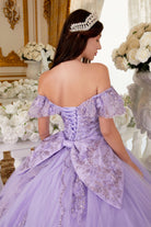 For a princess-worthy look, this off the shoulder floral ball gown is the perfect pick! Delicate scallop sleeves join an embroidered bodice with organza floral appliques, making for a truly romantic sight. The layered glitter tulle full skirt is further elevated by lace and more floral appliques for even more visual appeal. We love the flirty corset back closure with large bow detail and glitter print edging for a touch of sparkle. To finish off this divine number, there is a tiered back skirt layer with scalloped print that will make you shine like no other on your Quinceanera! You will be sure to take everyone's breath away as soon as you step into the room.