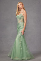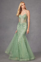 FORMAL MERMAID LONG PROM SLEEVELESS DRESS W/ V-NECK & FLORAL LACE APPLIQUE