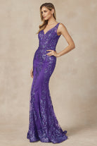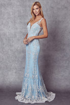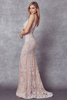 Made from 100% polyester, this elegant dress is available in four gorgeous colors - off white, pale petal, sky blue, and purple. The dress is designed with an illusion V-neckline and an open V-back, giving it a modern and stylish look.