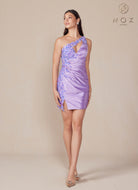Step into the spotlight with this stunning lilac one-shoulder mini dressβan eye-catching blend of elegance and allure. Designed with shimmering satin fabric, this fitted silhouette features delicate floral appliquΓ©s, flattering ruching throughout, and an asymmetric neckline for a modern, high-fashion finish. Whether you're heading to a cocktail party, homecoming, or evening celebration, this dress is guaranteed to make a statement.