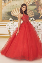 This stunning ballgown is crafted with delicate tulle and adorned with intricate beading, creating a breathtaking effect. The straight-across bodice and sweetheart neckline add a touch of elegance, while the voluminous skirt creates a dramatic and unforgettable look.