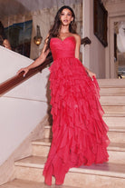 Float into your next formal event with elegance in this whimsical strapless tulle gown, available in purple, black, green, and red. The fitted sweetheart bodice highlights your curves while the voluminous multi-layered ruffle skirt adds ethereal movement. Perfect for prom, galas, bridesmaids, or quinceañera guests looking for timeless romance with a modern flair.