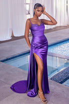 Purple, Gold & Ice Blue Satin Gown with Appliqué Sweetheart Neckline | High Slit Train Dress CDCD340