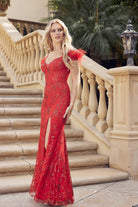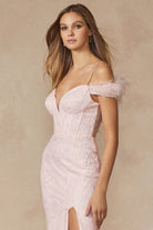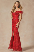 Glamorous and stylish, this dazzling prom dress features glittering leaf embellishments, feathered sleeves, and a sexy slit. Made from high-quality 100% polyester, it's perfect for making a statement on your special night.