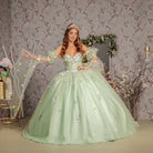 3-D Flower Ruched Bodice Mesh Ball Gown Long Puff Sleeves GLGL3300