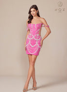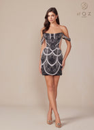 Make a bold entrance in this glamorous black and white mini dress featuring intricate art deco-inspired beading. Designed with an elegant off-shoulder neckline and sheer side mesh panels, this fitted silhouette hugs your curves while delivering vintage-inspired sparkle. Perfect for cocktail parties, formal events, or themed soirΓ©es, this dress is a head-turning blend of classic and modern flair.