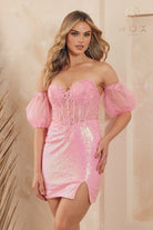 Short Strapless Dress And Sequin DetailsFabric Content:100% POLYESTER Short strapless dress with sequin details, a sweetheart neckline, detachable off-the-shoulder puff sleeves, a sheer corset boned bodice with beaded lace applique, and a leg slit.