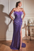 Inspired by the fan-favorite CH225, this sequin-studded beauty epitomizes glamour! The strapless gown features a glittering design, gathered at the side waist for a flattering silhouette that opens into a sultry leg slit. Delicate feathers adorn the neckline, sweeping around to the lace-up back, adding a touch of elegance and sophistication.
