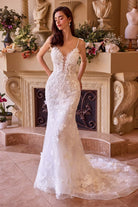 Step into forever with grace and romance in this stunning lace mermaid wedding gown. Featuring a plunging illusion neckline with delicate spaghetti straps, this dress sculpts your figure with a flattering mermaid silhouette. Intricate floral lace appliqués cascade throughout the gown, adding depth and texture, while the illusion back and flowing chapel-length train bring ethereal elegance to every step down the aisle.