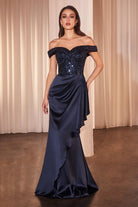 Navy Off-Shoulder Sequin Bodice Evening Gown with Satin Ruffle Skirt