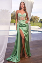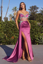 Black, Fuchsia, Teal, Red | Strapless Satin Corset Gown with Sheer Bodice, Rhinestone Appliqué & High Slit CDCD343