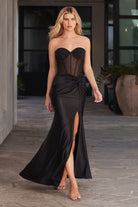 This fitted gown dazzles with a strapless sweetheart neckline and a sheer rhinestone-adorned bodice, adding a captivating shimmer to its elegant design. Crafted from soft satin, the gathered waistline and leg slit create a graceful silhouette, complemented by the supportive lace-up corset back. Perfect for prom or formal events, this dress brings together sophistication and modern glamour. Key Features: Silhouette: Fitted Design: Strapless sweetheart neckline, sheer rhinestone bodice, gathered waistline & leg slit Fabric & Material: Soft satin & hot stone embellishment Fit Detail: Structured bodice for enhanced support & lace-up corset bodice Occasions: Ideal for prom or formal events Sizing: Available in sizes 0 - 14