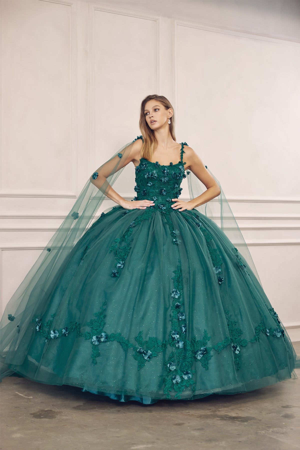 Long tulle cape with 3D flowers applique Quinceanera ballgown.Fabric content : 100% Polyester