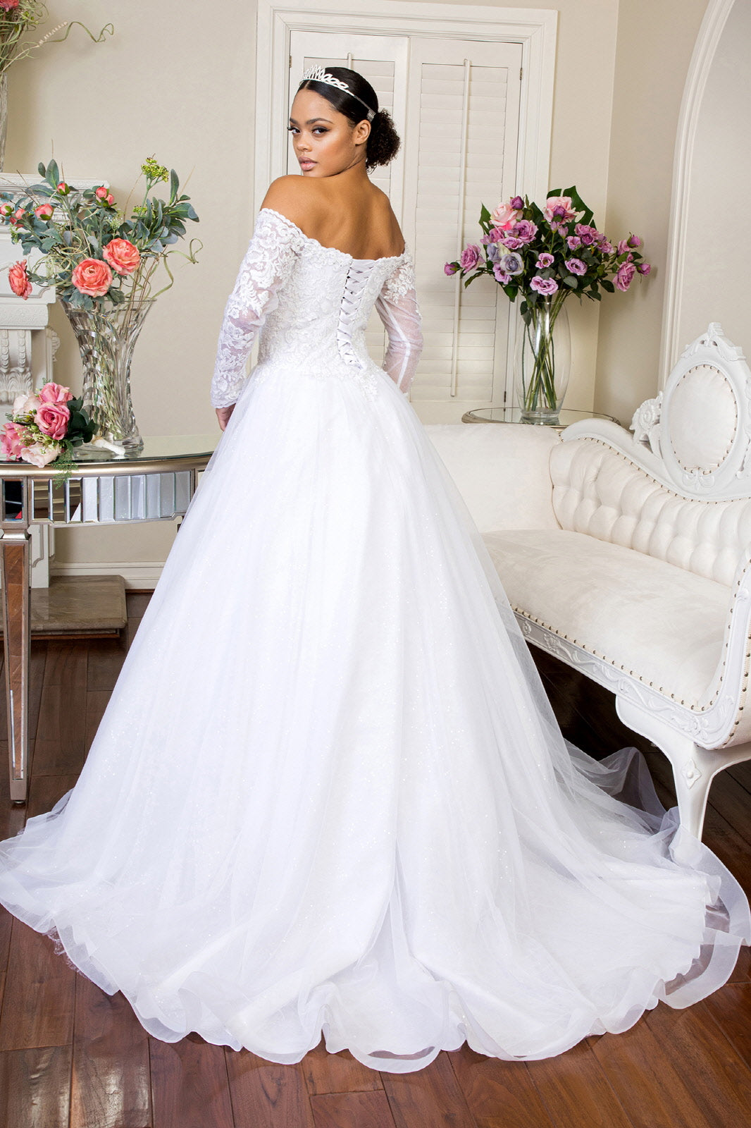 This deep illusion sweetheart neckline is utterly elegant! The mesh sleeves on this off-the-shoulder gown mimic long, white gloves that a princess would wear. Corset back with ball gown silhouette gives you more feminine look, and sophisticated embroidery is decorated beautifully on bodice and sleeves.