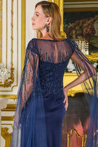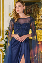 Bejeweled boat neckline cape sleeves metallic jersey slit skirt with trailing fabric GLGL3784
