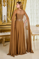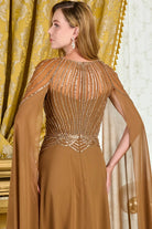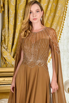 Bejeweled scoop neckline cape sleeves mesh bodice chiffon skirt a line dress GLGL3785