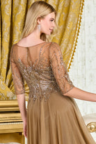 Boat neckline sleeves embellished mesh bodice metallic jersey skirt dress GLGL3786