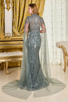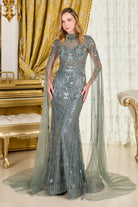 Embellished mock neck cape sleeves zipper fitted dress GLGL3836