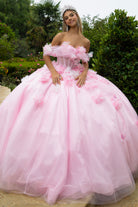 Capture hearts and take flight in this breathtaking blush pink quinceañera ball gown, a true masterpiece inspired by fairytales and fluttering dreams. Designed for the princess who lives life in full color and believes in magic, this gown features a sheer structured corset bodice adorned with whimsical 3D butterfly appliqués and soft floral accents. The off-shoulder organza puff sleeves gently frame the neckline, giving the dress an air of softness and storybook romance.