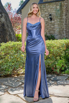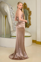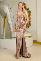 Adjustable spaghetti straps flower beads pleated detail bodice fitted slit stretch satin dress GLGL3701