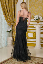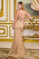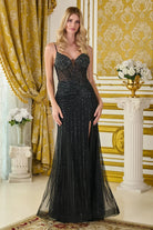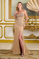 Bejeweled spaghetti straps v neckline corset bodice asymmetrical waist fitted dress with slit GLGL3697