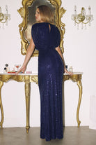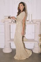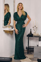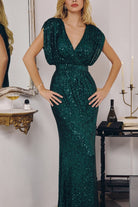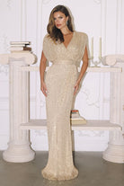 Make an unforgettable entrance in this dazzling full-length sequin gown. Featuring a draped surplice bodice with flutter sleeves and a flattering cinched waist, this figure-hugging silhouette delivers timeless glamour. Crafted from shimmering sequin fabric with a back zipper closure, this gown is ideal for evening galas, black-tie weddings, mother of the bride moments, or any formal event where sparkle is essential.