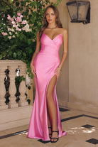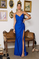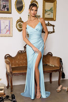 Deep V-Neck Fitted Gown Satin Formal Evening Dress with High Slit & Corset CDT102