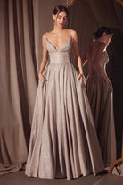 Radiate in every direction with this iridescent A-line gown, designed for effortless elegance. The softly draped bodice features a flattering cowl neckline and delicate spaghetti straps that lead into a romantic lace-up back. The shimmering full skirt flows into a structured silhouette complete with hidden pockets—perfect for twirling the night away. Fully lined for comfort, this dress delivers glamour without the need for an interior corset.