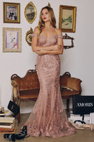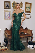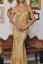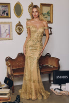 This fitted gown captivates with a luxurious blend of glamour and structure. Designed with an off-the-shoulder neckline and plunging illusion corset bodice, it enhances your shape with a sculpted silhouette that flares softly into a sweep train. The sequin lace fabric glistens with every movement, while a back zipper closure ensures easy and secure wear. Ideal for black-tie events, formal galas, or prom nights where elegance is essential. Silhouette: Fitted with subtle flare Design: Off-the-shoulder neckline, plunging corset bodice, sweep train Fabric & Material: Sequin lace with stretch lining Fit Detail: Structured bodice with zipper closure for secure fit Occasions: Ideal for formal galas, prom, pageants, mother of the bride, and black-tie events