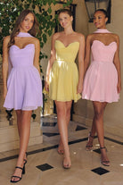 Flirty, feminine, and effortlessly chic — this short chiffon gown is a fresh take on classic partywear. Designed with a strapless sweetheart neckline and structured corset-style bodice, it enhances the figure while maintaining comfort and elegance. The lace-up back allows for a customizable fit, while the pleated skirt adds soft movement with every step. Complete with a matching chiffon neck scarf, this dress is perfect for homecoming, weddings, graduation celebrations, and any event where style meets sophistication. Silhouette: Fit & flare mini Design: Strapless sweetheart neckline, pleated skirt & matching chiffon neck scarf Fabric & Material: Lightweight chiffon Fit Detail: Corset-style bodice with lace-up back for adjustable support Occasions: Perfect for homecoming, wedding guests, graduations, spring events & parties Sizing: XXS – 3XL