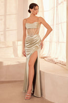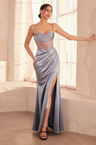 Designed to captivate, this satin gown features a draped cowl neckline and sheer boned corset bodice that sculpts and defines your silhouette. The fitted skirt showcases a thigh-high leg slit and sweeping overlay, offering fluid movement with every step. With a lace-up back detail for adjustable fit, this dress is made for unforgettable prom nights, red carpet events, or any formal affair.