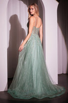 Step into your fairytale moment with this mint green A-line gown, beautifully crafted from shimmering glitter tulle and finished with a structured corset-style bodice. The sweetheart neckline and delicate spaghetti straps enhance the feminine silhouette, while the glittering vertical accents elongate your figure and add a dreamy sparkle to every step. With its flowing skirt and romantic hue, this gown is a perfect choice for prom, evening galas, or spring weddings.