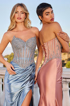 CRYSTAL STRAPLESS FITTED SATIN DRESS CDCD736