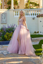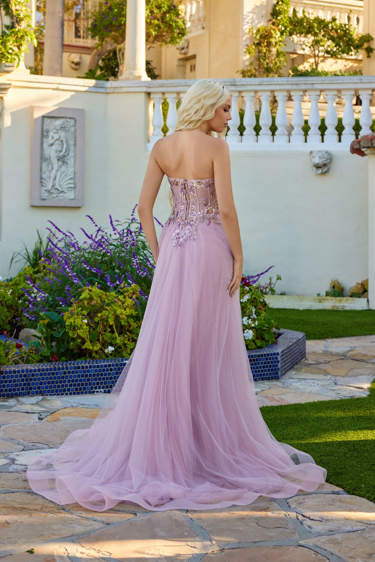 Strapless A-line gown with a structured corset bodice featuring defined cup shaping, sheer paneling, and intricate embellishment placed along the waist and upper skirt. Skirt is layered in soft tulle and designed with a front slit for ease of movement. Back includes a lace-up closure integrated into the corset for adjustable support and a smooth fit. Hem extends into a light, flowing train. Designed for formal events, prom nights, and occasions that call for a refined silhouette with detailed craftsmanship.