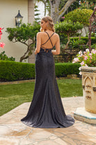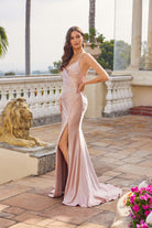 Satin gown with twist-front bodice cutouts, structured waist paneling, high leg slit, and floor-length skirt with back lace-up closure.
