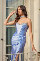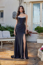 This gown brings full main-character energy with a structured bodice that sparkles at the neckline and a sleek silhouette that knows exactly how to make an entrance. The skirt drapes with effortless drama and slips into a thigh-high opening designed to turn calm walks into slow-motion movie scenes. The back laces together for that perfectly cinched finish, while the matching choker adds a little extra attitude because why not steal the whole spotlight?
