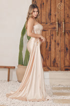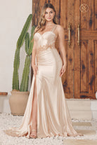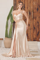 Fabric Content:100% POLYESTER Alluring satin gown that effortlessly combines elegance and beauty. This mesmerizing dress boasts intricate embroidered details, delicately accentuating its feminine sweetheart neckline. With a touch of sophistication, the gown features a chic high slit, adding a hint of allure and modernity.